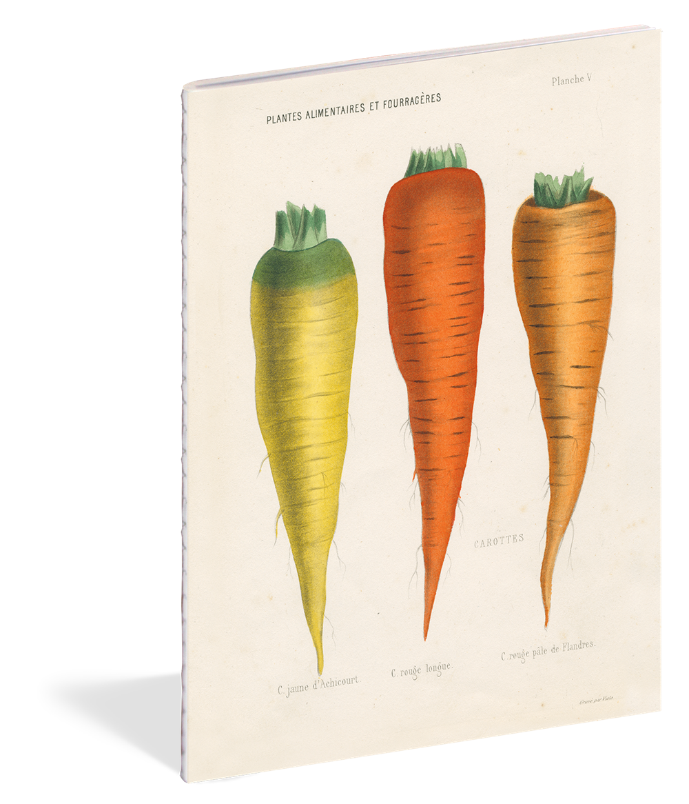 A trio of notebooks featuring cover imagery themed to kitchen delights, such as carrots, strawberries, and quince, curated by the beloved home goods designer and New York Times bestselling author John Derian.