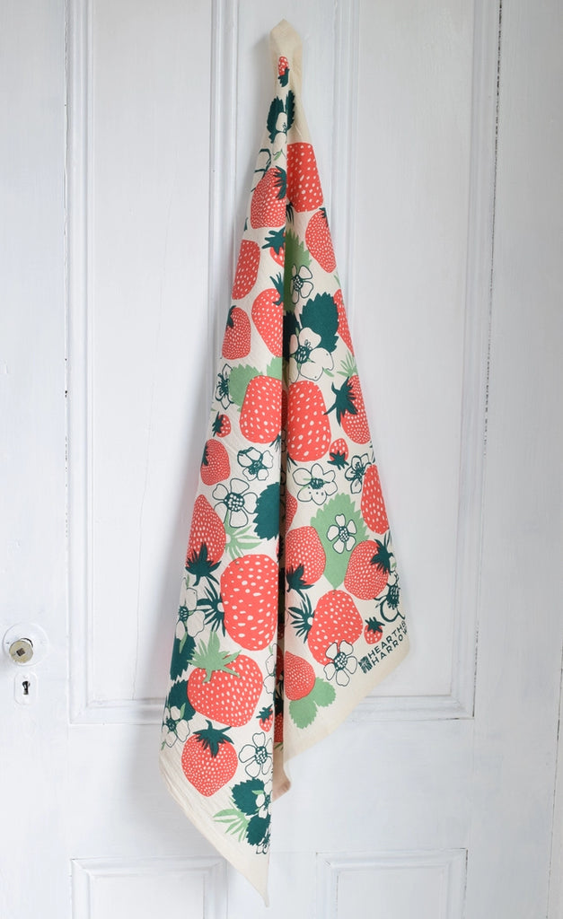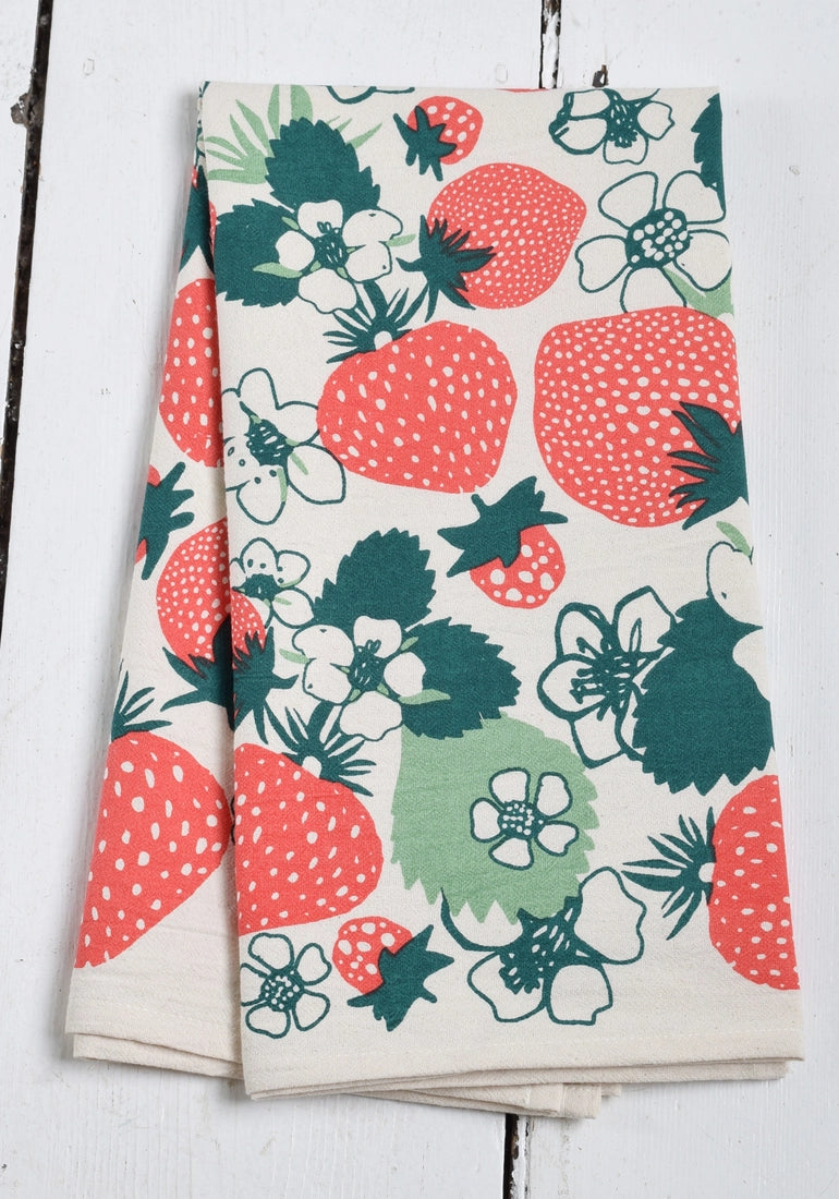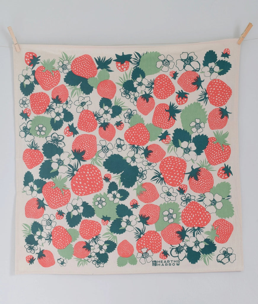 Our oversized Strawberry tea towel evokes Grandma's vintage tablecloths and linens, classic yet modern! Designed in our Rockport, Maine studio and hand printed with eco-friendly, water-based inks on organic unbleached cotton, it is not only a wonderful addition to a natural kitchen but a beautiful eye catcher. It's large 30" x 30" size has an allover print and can be folded any which way without losing any detail. Our printing process is permanent, making this towel washable and intended for repeated use. A twill hanging loop is sewn in for convenience.