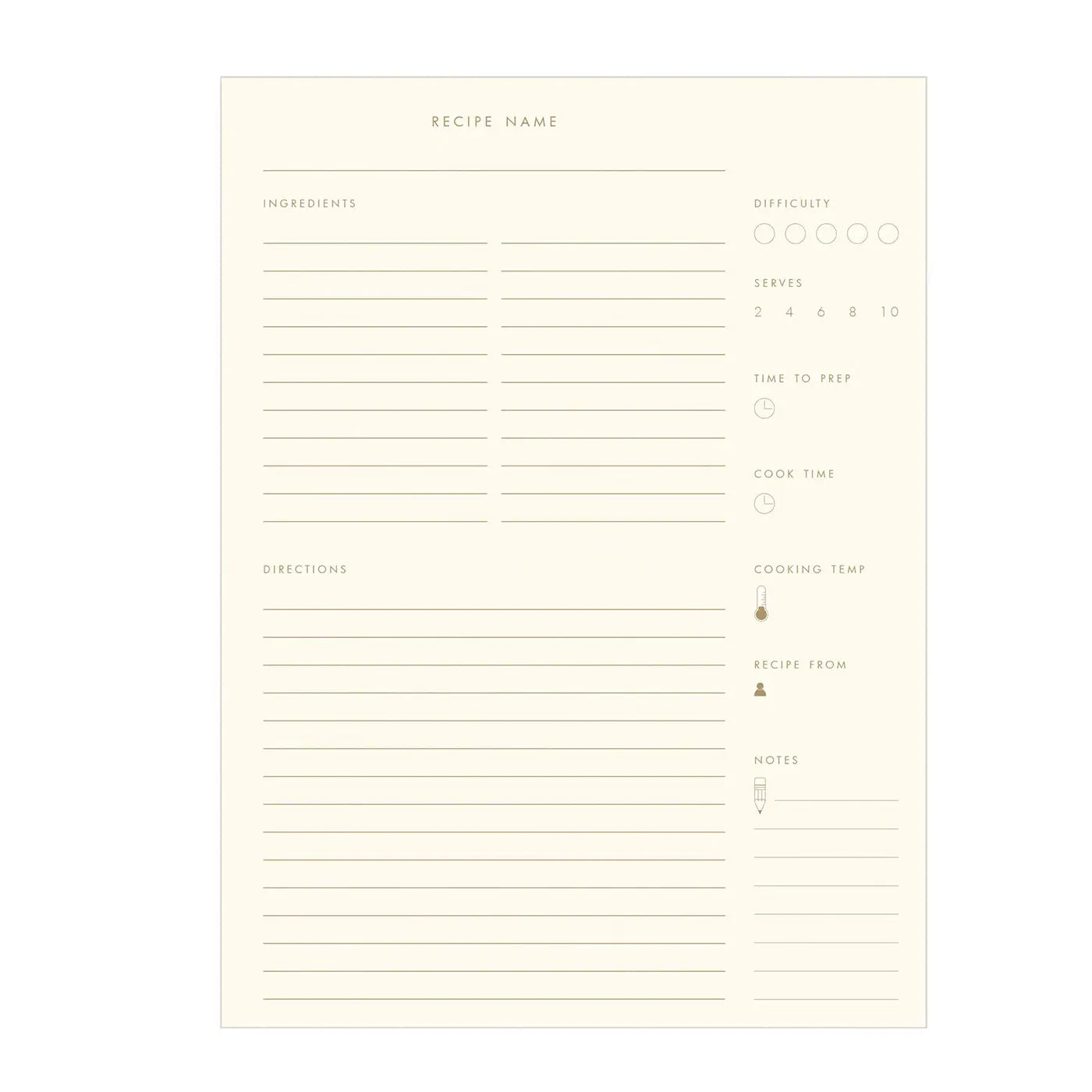 Let the flavors melt into every page with our butter-themed recipe book. The five categories including: Soup & Salad, Starters & Snacks, Side Dishes, Main Dishes, and Desserts. Each category contains 10 double-sided recipe sheets with space for 20 total recipes. The Main Dishes section has five extra recipe sheets, with space for 30 recipes.